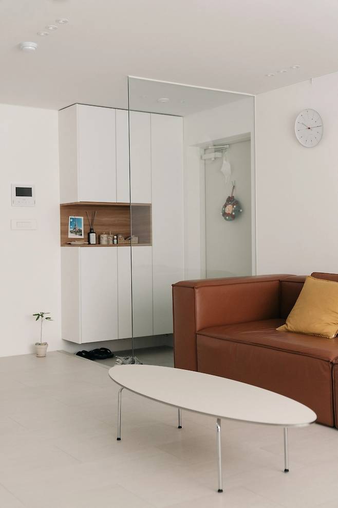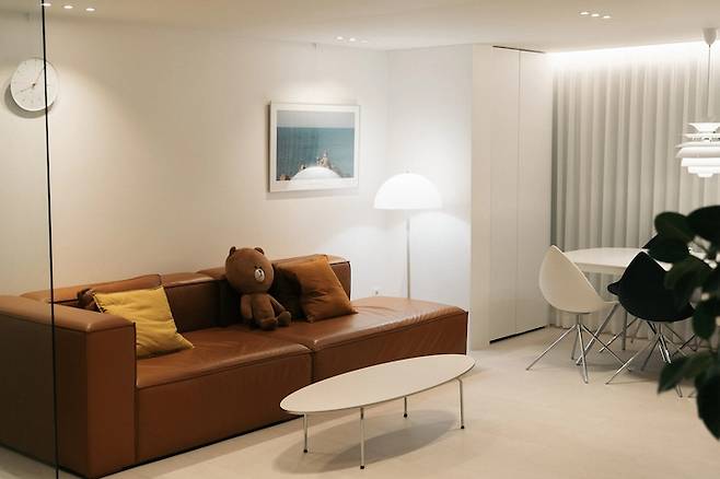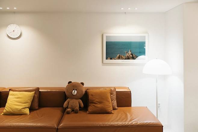 저희 집이 온통 흰색이다 보니, 이 카멜색의 소파가 중심을 잘 잡아두고 있는 느낌이에요. 소파 위에는 시계와 사진 액자를 두었는데. 이 아르네 야콥센 뱅커스 시계를 오늘의집 스토어 특가 때 샀다가... 사자마자 깨 먹어서 유리가 없는 채로 쓰고 있답니다. 유리 케이스 없어서 먼지가 좀 앉긴 하지만... 괜찮아요.
