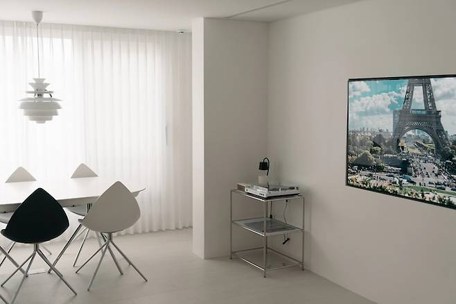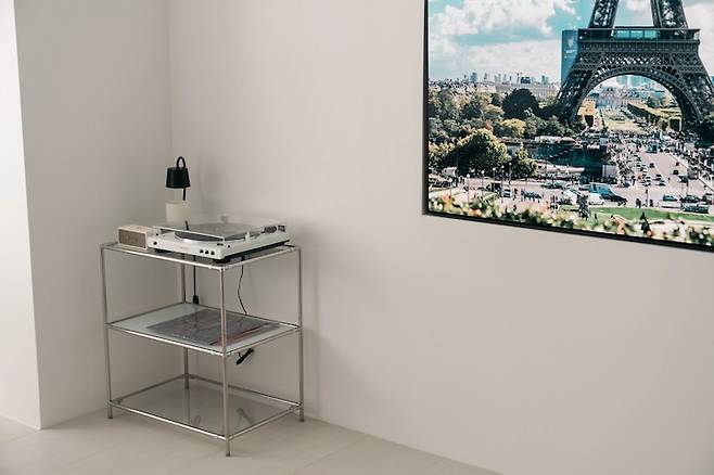 소파에서 보기도 적당하고, 식탁에 앉아서 보기에도 적당합니다. 손님이 올 때는 유튜브에서 음악을 트는데 오브제 역할을 같이 해주어서 좋더라고요.