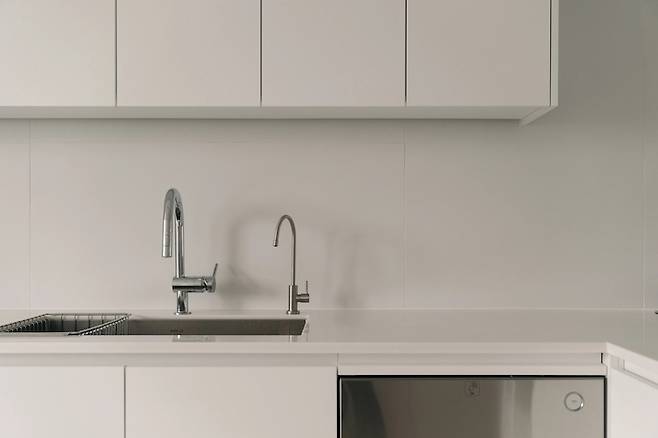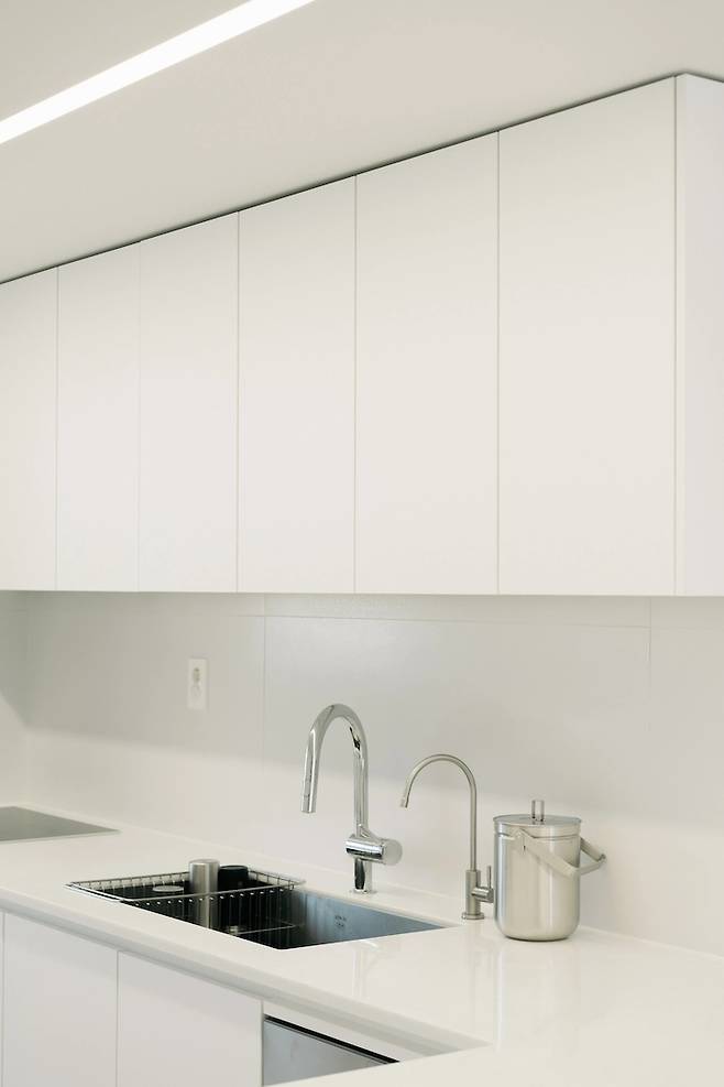 그래서 상부장도 두었어요. 상부장이 열을 맞춰 정렬되어 있는 게 상부장을 없앤 주방보다는 깔끔하겠지 생각이 들더라고요. 결과적으로 상부장에 모두 집어넣어서 지금의 깔끔한 주방을 유지할 수 있는 것 같아요.