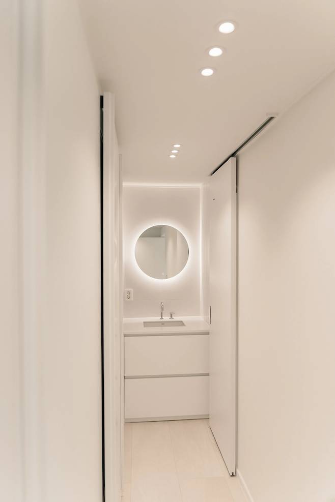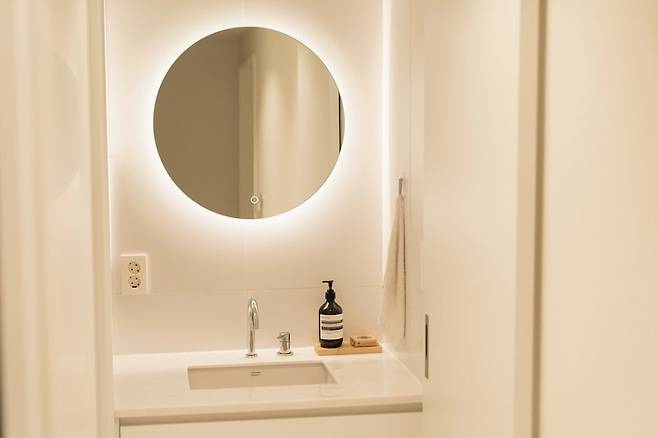공용 화장실은 최대한 간결하게 했어요. 구축이라 화장실이 넓지 않아서 너무 큰 타일을 쓰기보다는 한쪽이라도 넓게 쓸 수 있는 400*800 타일로 시공했고요. 어두운 톤보다는 밝은 톤이 어울릴 것 같다는 인테리어 사장님의 말을 듣고, 밝고 따뜻한 톤의 타일을 골라보았습니다. 그리고 조명 계획이 좋았어요. 화장실 거울장 위/아래로 간접 조명을 넣었는데 늘 이 조명만 켜고 사용하고 있어요.