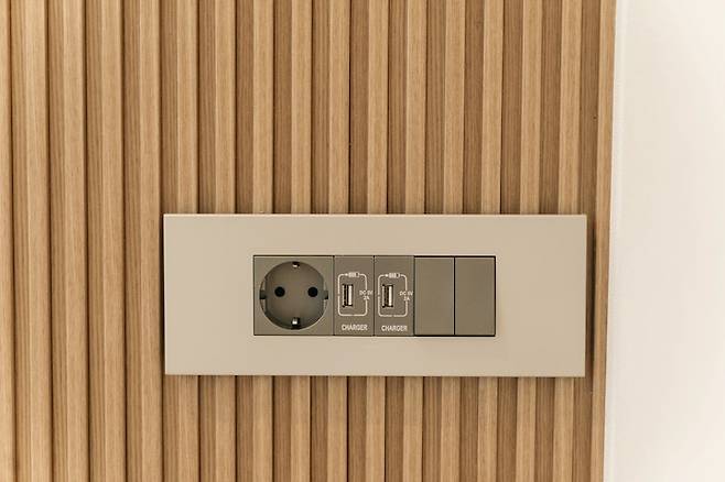 안방 침실 쪽 불은 이쪽 콘센트에서 모두 켜고 끌 수 있도록 해두었어요. 르그랑 아테오 유럽형 콘센트+스위치 조합형을 두었습니다. 집에는 다 화이트 제품을 썼는데, 여기만 그레파이트 제품으로 넣어보았어요. 템바 보드 위로 공간이 좀 있어서 핸드폰을 안전하게 거치해둘 수 있어요.