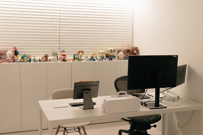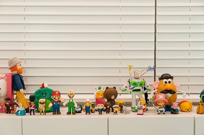 수납장 위에는 저희 부부가 소소하게 모았던 피규어들을 올려두었어요. 자잘하지만 이렇게 한데 모아두니 귀엽고 뿌듯한 느낌도 들고, 좋아하는 것들과 가까이 있구나 하는 생각이 들어서 서재에 들어갈 때마다 기분을 좋게 해주더라고요.