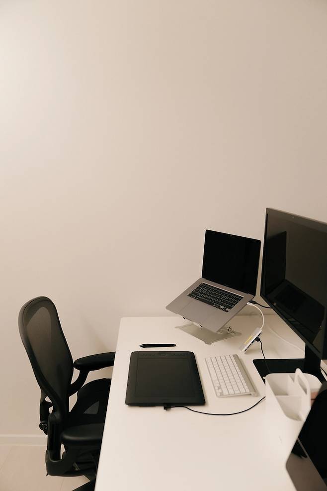 서재에는 1800 두닷 콰트로 에어 책상을 두었어요. 예전에는 벽에 두었는데, 양쪽 면을 다 쓰기 벽에서 띄워서 배치했어요. 여기서는 재택근무를 주로 하고, 집중할 일이 있을 때 들어가서 일하는 편이에요. 저희는 보통 노트북이나 아이패드를 쓰곤 하는데, 여기서는 모니터를 같이 쓸 수 있어서 활용도가 좋더라고요.