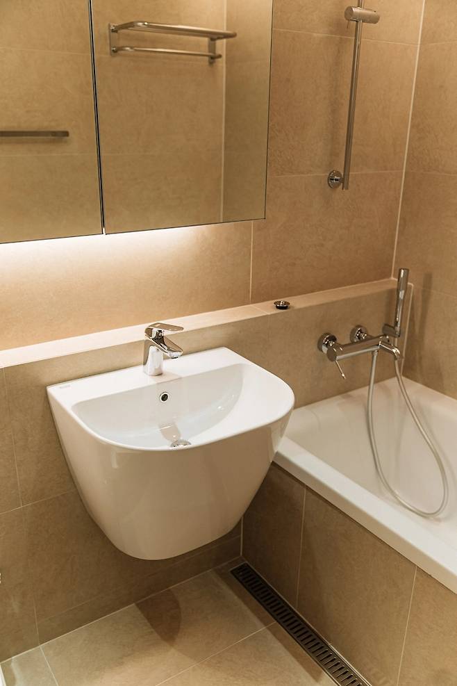 세면대는 언더 카운터 형식으로 만들었어요. 주방과 동일한 인조대리석 상판을 써서 세면대를 만들었고, 그런 김에 세면 수전도 비슷한 제품을 골라서 사용했어요.