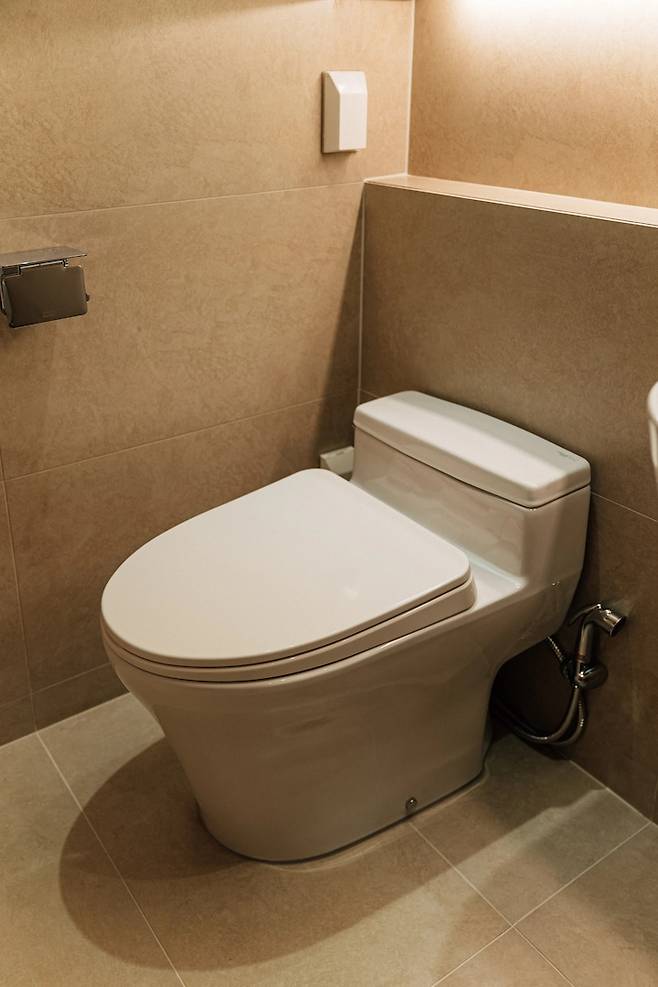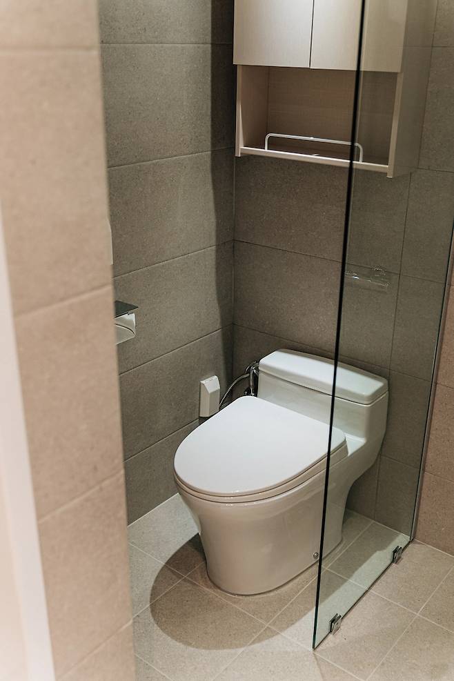 안방 화장실은 샤워 부스를 넣는데 초점을 맞춰서 바꿨어요. 안방 이야기하면서 말씀드린 것처럼 세면대를 밖으로 뺐고, 샤워 부스를 만들 수 있는 공간을 확보했죠. 화장실 입구는 슬라이딩 도어로 했는데 잠기진 않아도 어차피 안방 안에 있어서 괜찮겠다 생각했어요.