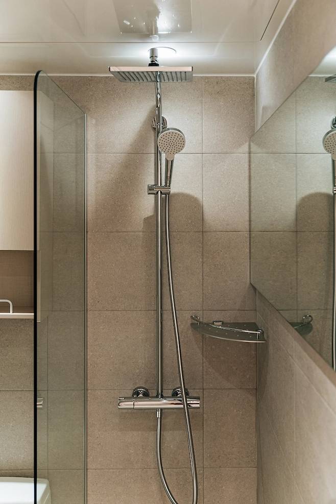 샤워 부스 수전은 한스그로헤로 달았어요. 매일 샤워를 하는데, 수전만큼은 좋은 걸 썼으면 좋겠다 싶어서 독일 아마존을 통해서 구매했습니다. 샤워 부스 옆에는 거울을 통으로 달아서 넓어 보이게 만들었어요.