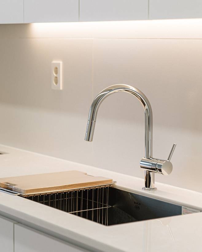 수전은 처음 본 순간부터 그로헤 민타로 하고 싶었어요. 독일 아마존을 통해서 직구했고 만족하고 있습니다. 진짜 수전을 잘 두는 것만으로도 주방 분위기가 바뀌는 것 같아요. 물도 너무 부드럽게 나오고, 물 튀김은 심하지 않은 것 같아서 만족해요. 크롬이라 물때가 끼는데, 닦아줄 때마다 반짝반짝거려서 기분이 좋아지고요. 그거 생각하면 관리할 만하다고 생각해요.