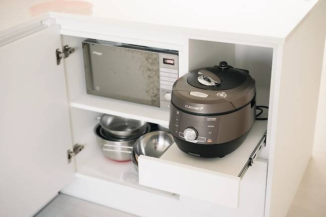 주방에 최대한 물건을 없애고 싶었어요. 그래서 주방 가구를 만들 때 위에 올라오면 안 되는 물건들은 미리 자리를 잡아서 넣을 수 있게 구성해 보았어요. 그래서 밥솥, 전자레인지, 에어프라이어는 모두 가구 안쪽에 수납하였고요. 쓸 때만 문을 열고 쓰고 있어요.