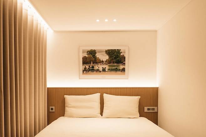 침대 위에는 액자 라인을 두어서 직접 찍은 사진을 걸어두었어요. 파리 튈트리 정원에서 찍은 사진이에요. 이케아 액자에 프린팅 해서 걸어두었습니다. 액자가 전체적인 침실의 분위기를 잘 잡아주고 있어요.