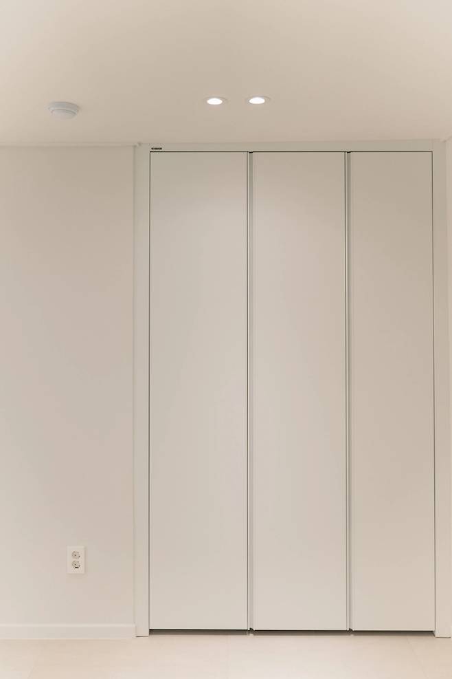 내력벽을 틀 수 없는 구조여서 걱정했는데. 오히려 내력벽이 페인트 마감이 되어있으니 갤러리 느낌이 들더라고요. 소파 쪽 내력벽은 장을 짜서 에어컨과 기타 수납을 할 수 있는 공간으로 만들어서 활용하고 있고요. 안방 베란다 쪽 내력벽은 베란다로 진입하는 방화문을 시야에서 가려주는 역할을 하고 있어서 더 좋은 것 같아요.