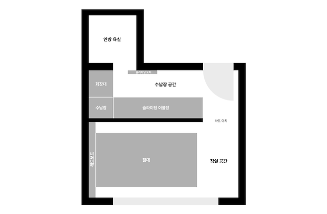 그래서 안방을 이렇게 둘로 나누어보았어요. 딱 침대가 들어갈 공간을 남기고 슬라이딩 장을 두어서 공간을 구분했습니다. 슬라이딩 장으로 만드니 문 열릴 공간을 확보할 필요도 없고, 장도 더 넓게 만들어 쓸 수 있어서 실용적이었어요. 무엇보다 침대에서 장이 바로 보이지 않는 것이 좋더라고요.