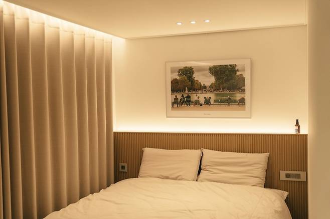 배관 연결을 해서 안방 침실 끝부분은 목공으로 가려두어야 했어요. 그 부분에 헤드보드를 만들었습니다. 저희가 원래 쓰던 침대는 헤드보드 없이 매트리스만 있는 모델이어서 필요했는데, 잘 맞아떨어진 것이죠. 헤드보드는 템바 보드 형태로 만들었고, 영림 필름을 붙어서 우드 느낌이 나도록 만들었습니다. 헤드 보드 위에는 LED 간접 조명을 넣어서 자기 전에 켜두는 용으로 쓰고 있어요.