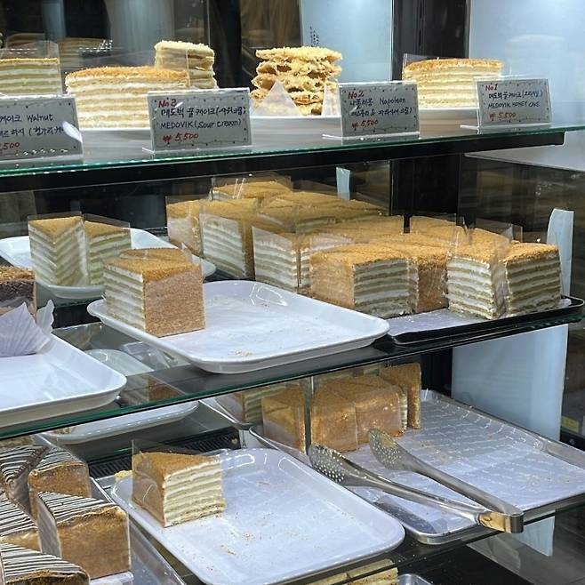 동대문 DDP 맞은편 몽골타운과 중앙아시아길이 모여있는 광희동에 줄 서서 먹는 러시아케이크 집이 있다. 상호가 그대로 ‘러시아케익’인데 메도빅 꿀케이크, 나폴레옹, 호두케이크, 초코 마스카포네 등 보기엔 화려하지 않지만 한번 맛보면 헤어나올 수 없는 러시아 디저트가 가득하다. 특히 메도빅 꿀케이크가 가장 인기가 좋은데 달달한 꿀이 층층이 들어가 아메리카노와 먹으면 순식간에 사라진다. 나폴레옹 케이크는 겉이 바삭해 씹을 때 식감이 독특하고, 꿀케이크와 번갈아 먹기 딱 좋아 단골들에게 인기가 좋다. 참고로 이곳은 테이크아웃만 가능하다.