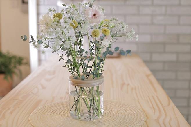 제가 만든 화병에는 5가지의 꽃을 다듬어 담아놓았어요!