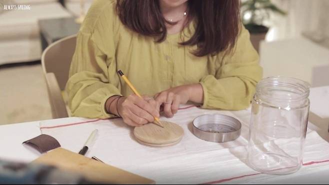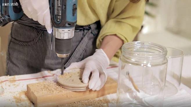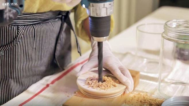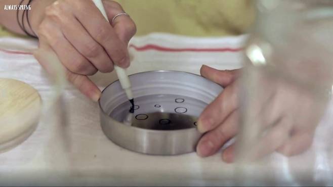 ① 드릴 날 굵기에 맞춰 용기 뚜껑에 펜으로 동그라미를 그려줍니다. 금속 뚜껑은 안쪽에, 나무 뚜껑은 바깥쪽에 그려줬어요.