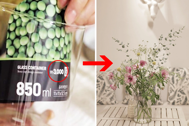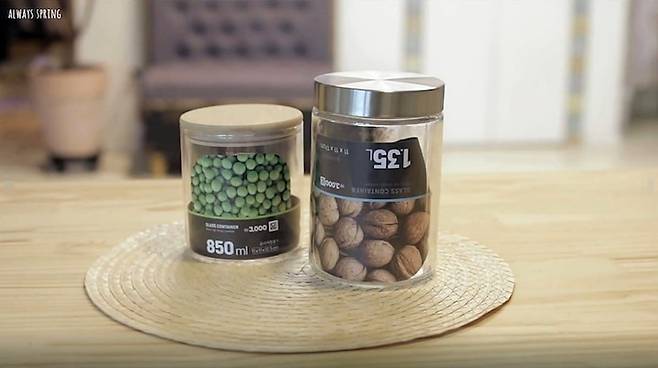 그래서 꽃을 데려오기 전에 꽃 담을 화병을 사러 다이소에 다녀왔어요. 특별한 화병을 만들고 싶어 일반 화병 대신 유리 저장 용기 두 개를 사 왔답니다.