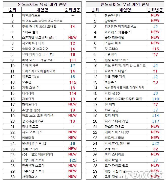 안드로이드 게임 순위에서는 신작 게임들이 차트 상위권에 올랐다.