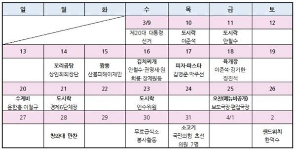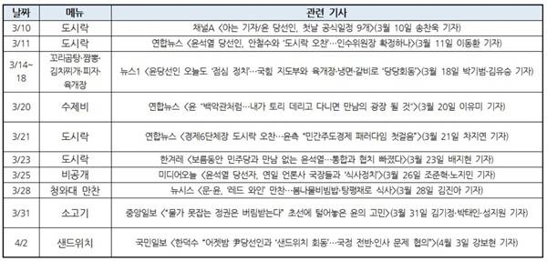 | ▲ 언론에 등장한 윤석열 당선자의 식사 메뉴와 동행인(3/10~4/2) |