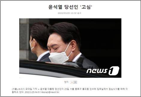 | ▲ 점심식사를 위해 이동하는 윤 당선자 사진에 ‘고심’이라고 표현한 뉴스1(3/25) |