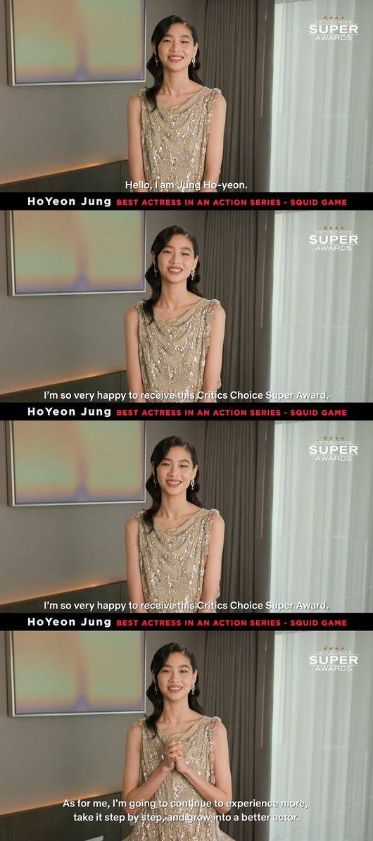 액션 시리즈 부문 여자 연기상을 수상한 정호연은 "크리틱스 초이스 슈퍼 어워즈에서 수상을 하게 돼서 진심으로 기쁘고, 이 기쁨을 저희 '오징어 게임' 식구들과 함께 나누고 싶습니다"라며 진심 어린 감사 인사를 전했다. 이어 "저는 앞으로 더 많은 경험을 쌓고 한 발 한 발 나아가서 멋진 배우로 성장해보도록 하겠습니다. 감사합니다"라며 앞으로의 포부를 전하는 말로 소감을 마무리 지었다.