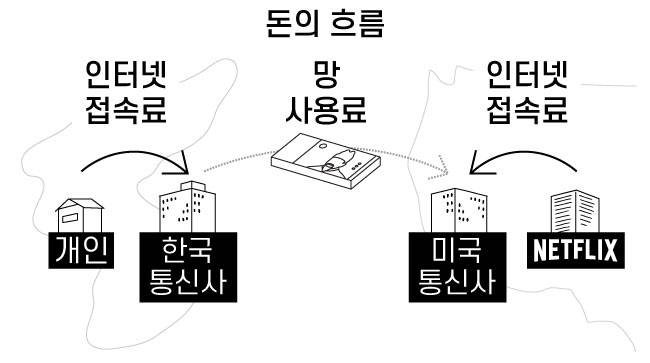 우리가 넷플릭스에서 영화 한 편을 보려면 한국 통신사와 미국 통신사를 모두 거쳐야 합니다. 넷플릭스가 미국 통신사에 영화를 보내면, 그걸 미국 통신사가 다시 한국 통신사에 보내고, 그 영화를 우리가 보는 거죠.