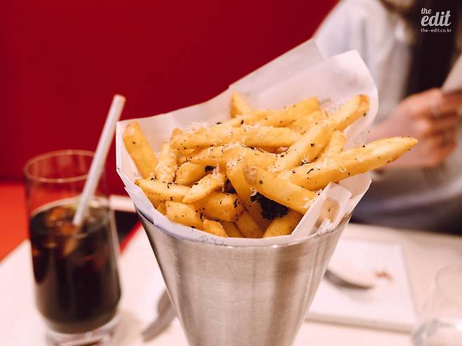 한 입 베어물었을 때 입안에 퍼지는 육향이 아주 강력하다. 미디움 레어로 구운 패티는 육즙도 육향도 가득 품고 있는데, 써니사이드와 패티가 서로 섞여서 입안에서 스르륵 녹는다. 루꼴라는 다른 재료에 비해 존재감이 없어서 내가 루꼴라를 먹긴 먹었나 싶긴 하다. 약간의 느끼함을 잡아주거나 경쾌한 식감을 더하는 역할을 하는 듯하다. 포레스트 버거의 핵심은 머쉬룸 라구와 그루이어 치즈인데, 나는 이 두 재료를 처음 맛본 거였다. 무슨 맛인가 싶어 메뉴판을 다시 들여다봤다. 머쉬룸 라구는 쉽게 말해 버섯 조림이라고 하는데, 양이 조금만 더 많았어도 패티의 육향까지 집어삼켰을 것 같다. 훌륭한 밸런스다. 가격은 3만 3,000원.