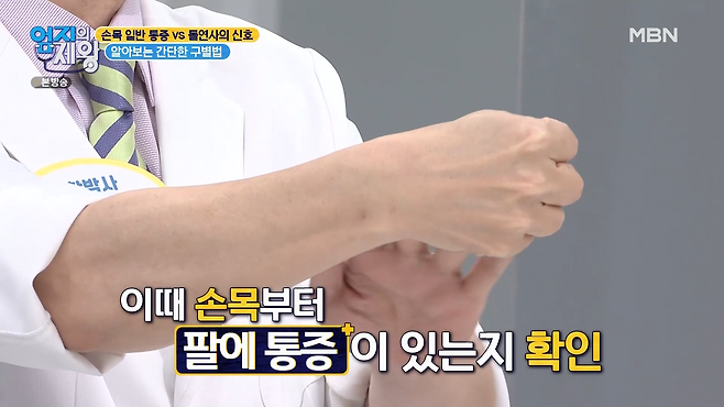 이떄, 손목부터 팔에 통증이 있는지 확인을 하시는 건데요