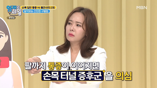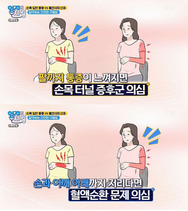여기서 팔까지 통증이 느껴지면 직장인이나 주부들이 흔히 겪는 손목 터널 증후군을 의심할 수 있습니다.