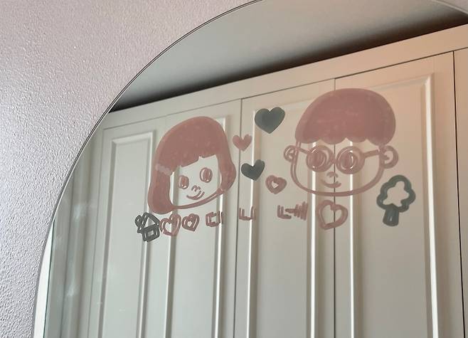 귀여운 걸 특히 좋아하는 저는, 남편과 저의 캐릭터 설정부터 시트지 인쇄까지 한 업체에 의뢰했어요. 정말 집에 진심인 것 같지 않나요~? 현관의 큰 거울에 붙여 놓았답니다. 우리 집!이라고 나타낼 수 있는 시그니처를 만들어 도장을 꾹 찍고 싶었던 것 같네요. 하하.