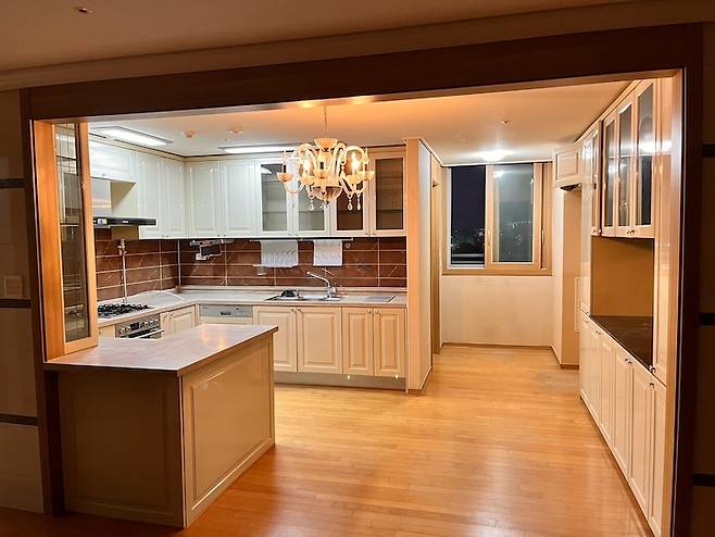 다음은 주방입니다. 처음 ㄷ자 형태의 주방 모습이에요. 처음엔 하부장 디자인이 나쁘지 않은 것 같아 필름을 붙일까도 생각해 보았는데요. 아무래도 저의 로망인 우드앤화이트 주방을 포기할 수가 없더라구요. 전체적으로 위의 가벽이 보이시나요? 현 사진에서 바로 왼쪽에 안방이 위치하고 있는데, 둘 사이의 간격이 너무 좁아서 집 전체를 답답하게 만드는 듯했어요. 저희는 가벽을 다 부수고, ㄷ자 주방 대신 ㄱ자 주방으로 가기로 결정했습니다.