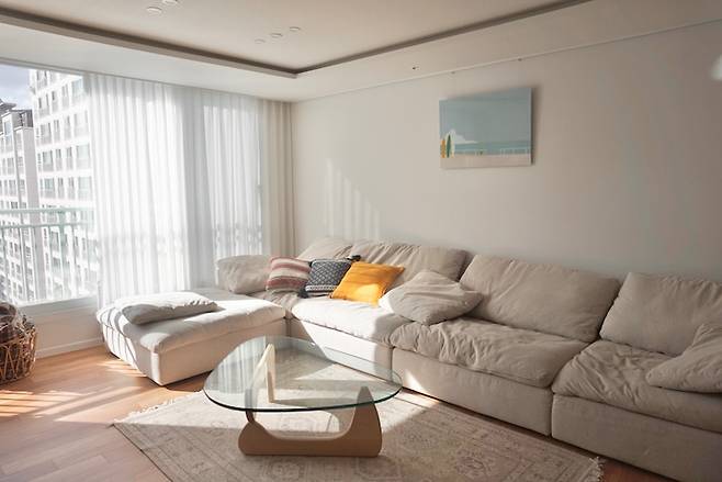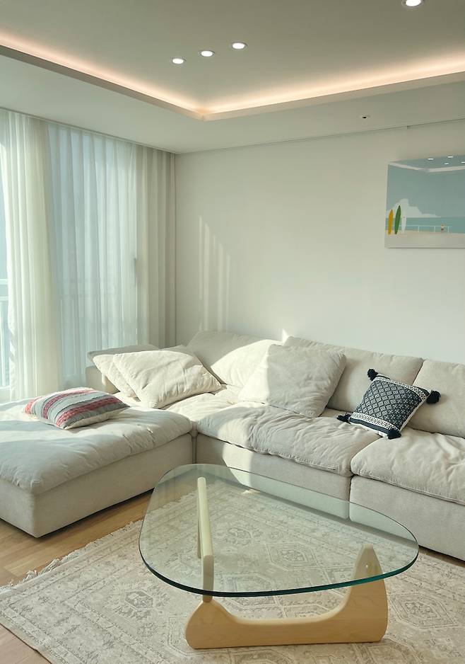 남서향의 우리 집. 낮에도 햇빛이 잘 들어 살짝 더울 정도예요. 포근한 소파와 곡선이 참 예쁜 테이블, 이런 가구들로도 충분히 예쁘고 따뜻한 분위기를 자아낼 수 있는 것 같아요.