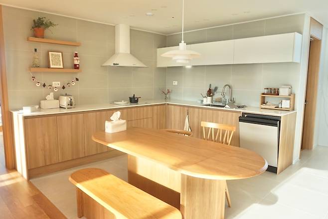 짠! ㄱ자 구조의 주방으로 변신. ㄷ자 구조에서 변경해서 조리할 공간이 부족하진 않을까 걱정이 됐지만, 은근히 주방 폭이 넓어서 공간은 충분하더라구요. 창은 오른쪽 한편에 있어서 환기하기에도 좋고, 햇빛도 참 예쁘게 들어요. 사실 저희는 11자 구조의 아일랜드 주방을 하고 싶었고, 실제로 저희 아파트에 시공 선례가 있어서 고민을 많이 했는데요. 그러기엔 저 식탁이 너무 커서 공간이 부족하겠더라구요.