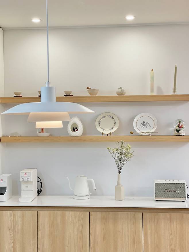 이 공간이 저는 홈바로 제격이겠다는 생각이 들었어요. 그 결과, 매일 음악이 흘러나오는 예쁜 홈바가 되었어요. 부지런히 사 모은 장식 소품들이 제자리를 찾았구요. 그리고 전에 살던 전셋집에서는 수납공간이 너무 부족해서 공간이 넉넉한 냉장고장을 짜놓았어요. 전 흰색+무광을 좋아하기 때문에 최대한 인테리어 실장님께 제가 원하는 분위기의 사진을 많이 보여드리면서 요청드렸습니다.