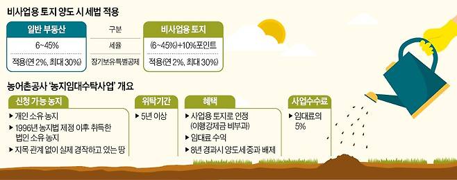 그렇다면 양도세 중과세와 이행강제금을 피할 수 있는 방법은 없을까. 한국농어촌공사 산하 농지은행이 운영하는 농지임대수탁사업이 해답이 될 수 있다. 이 사업은 노동력 부족, 고령 등으로 직접 영농이 어려운 농지를 위탁받아 이를 필요로 하는 농업인에게 다시 임대하는 사업이다.