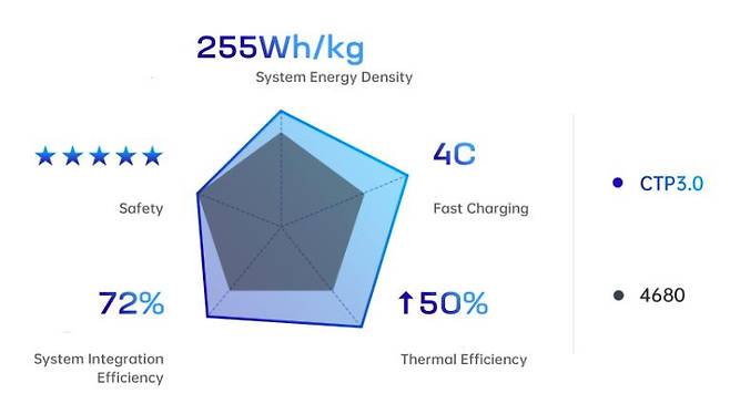 3세대 CTP(셀-투- 팩) 기술을 사용한 기린 배터리는 72%의 볼륨 효율과 최대 255Wh/kg의 에너지 밀도로 세계 최고 수준이다.