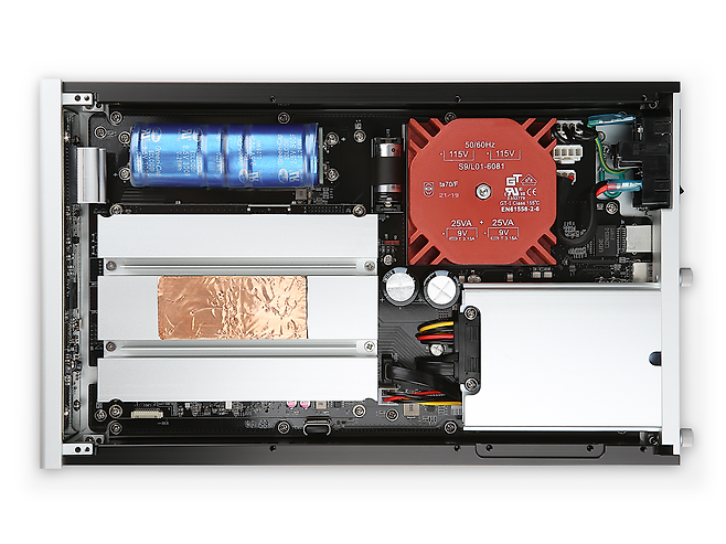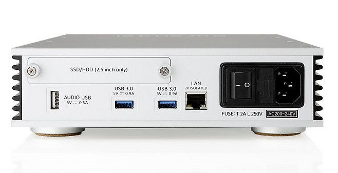 N150은 스트리머이지만 캐싱 뮤직서버이기도 해서 내부에 240GB 용량의 SSD를 갖췄고 후면의 빈 슬롯에 2.5인치 HDD나 SSD 드라이브를 하나 장착할 수 있다. 물론 NAS 음원이나 USB 스토리지에 대한 캐싱 플레이도 가능하다. CPU는 인텔의 듀얼 코어 프로세서, 메모리 용량은 8GB, 디지털 클럭은 OSC(크리스탈 오실레이터)를 쓴다. USB 출력 음원 스펙은 PCM은 32비트/384kHz, DSD는 DSD512(네이티브), DSD256(DoP)이다.