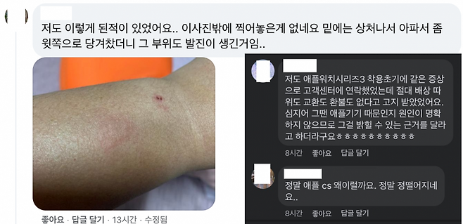 3년 이상 문제없이 착용한 애플워치가 손목에 어느 날 궤양을 일으켰다면? 애플은 "기기 결함이 아니니 보상은 불가하다"는 입장. 그러나 피해자는 "보상보다는 애플의 무성의한 대응에 화가 난다"고 지적했다. 이뿐만이 아니다. 국내에서는 앞서 비슷한 사례를 겪은 여러 사용자들이 있으며, 그들 모두 공통적으로 애플의 응대 태도를 비판했다.