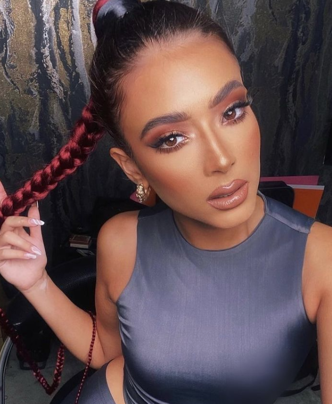 구릿빛 피부를 강조한 피부 메이크업에 다크 브라운 섀도로 눈매를 강조했네요.