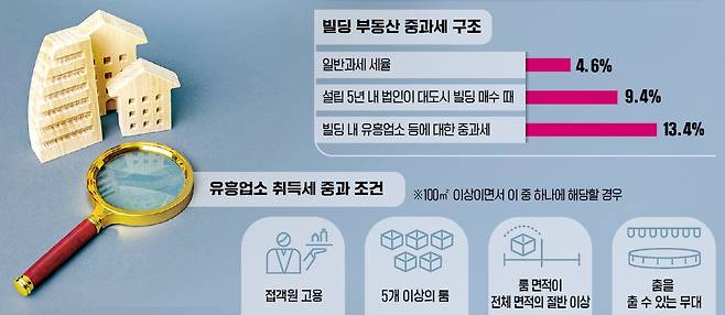 전체 연면적의 절반을 유흥주점으로 사용하고 있는 건물을 100억원에 매입하면 50억원에는 4.6%, 나머지 50억원엔 13.4%의 취득세율이 적용돼 9억원을 취득세로 내야 한다. 유흥주점이 없을 경우의 취득세 4억6000만원에 비해 세 부담이 두 배 가까이로 늘어난다. 유흥주점 등에는 재산세도 중과된다. 일반 상가와 사무실의 재산세율은 0.25%지만 유흥주점에는 4%가 적용된다. 역시 전체 건물 토지에서 유흥주점 등에 해당하는 토지 비중을 따져 건물주에 부과된다.