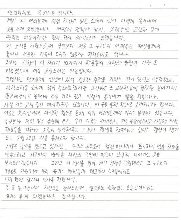 제가 팬 여러분께 직접 전하고 싶은 소식이 있어 이렇게 용기 내어 글을 쓰게 되었습니다. 어떻게 전해야 할지, 오랫동안 고심한 끝에 떨리는 마음이지만 한자 한자 써내려가 보겠습니다.