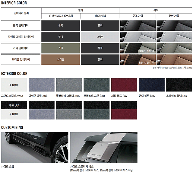 그릴 우측 하단에 TORRES 레터링 역시 세련된 멋을 더해준다. 상단 그릴부터 하단 에어인테이크까지 블랙아웃 처리되어 있어 바디컬러와 대비감을 주며 묵직한 인상을 전해준다. 플래티넘 그레이 컬러는 무게감이 없지 않으면서도 측면의 두터운 클래딩과도 대비를 이루어 도시적이면서 담백한 이미지가 느껴진다.