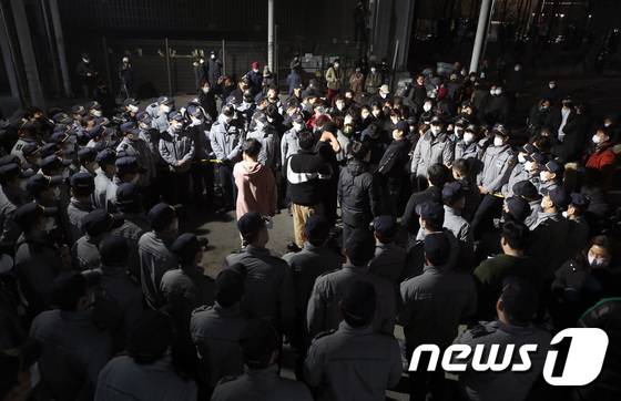 (인천=뉴스1) 정진욱 기자 = 10일 인천시 부평구 삼산체육관에서유튜브 채널 '가로세로 연구소(가세연)' 와 일부 인천 시민들이 '부정선거'를 주장하며, 경찰과 대치를 하고 있다. 경찰은 가세연측에 의해 투표소 이동이 어려워 지자 투표함 이송을 위해 '동원령'을 발령했다. 2022.3.10/뉴스1
