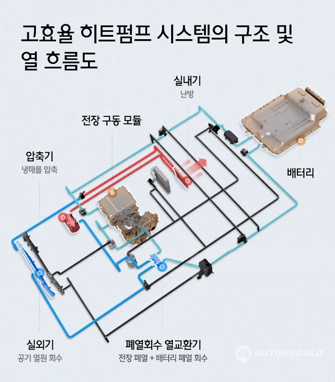 전기차는 내연기관차와 동일한 냉방장치를 사용하지만 엔진과 같은 열원이 없는 난방장치는 구조에 차이가 있습니다. 따라서 겨울철과 같이 추운 날씨 때 난방을 위해 난방장치 대신 냉방장치를 사용합니다. 즉 에어컨의 작동원리와 반대로 에어컨 컴프레서를 구동시켜 압축된 뜨거운 열을 실외(라디에이터)가 아닌 실내에 방출하고 증발 잠열을 차량 외부로 보내는데 이러한 시스템을 히트펌프 시스템이라고 부릅니다.