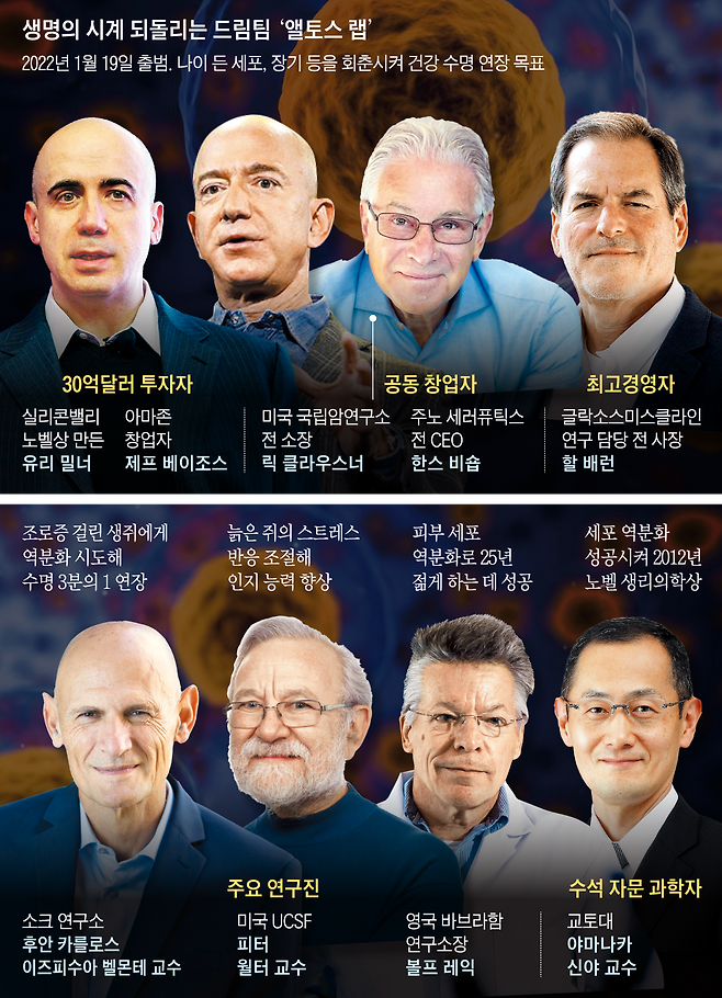 영화 ‘벤저민 버튼의 시간은 거꾸로 간다’의 상상력을 현실로 만들 드림팀이 떴다. 세계 최고 부자인 아마존 창업자 제프 베이조스와 실리콘밸리 노벨상인 ‘브레이크스루상’을 만든 억만장자 유리 밀너는 앨토스 랩에 30억달러(약 3조6100억원)를 투자하기로 했다. 연구진에는 노벨상 수상자를 비롯해 세계 각국 항노화 석학들이 속속 합류했다. 평생 건강하게 살다가 마지막 날 편안하게 침대에서 생을 마감하는 인류의 꿈은 실현될 수 있을까.