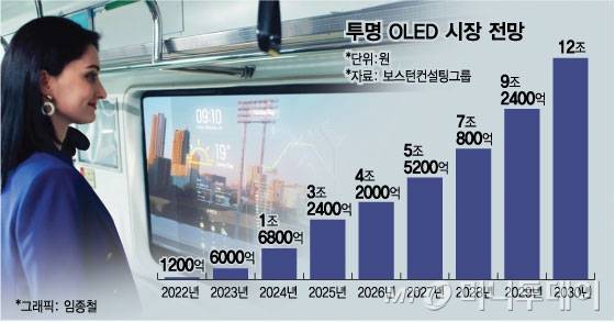 일반 OLED보다 아직까지는 가격이 4~5배 비싸다는 점이 변수지만 전문가들은 수요가 늘고 가격 경쟁력을 갖추게 되면 시장이 폭발적으로 성장할 것이라고 본다. 글로벌 컨설팅기업 보스턴컨설팅그룹(BCG) 연구조사에 따르면 전 세계 투명 OLED 시장 규모는 올해 1200억원 수준에서 2025년 3조2400억원, 2030년 12조원 수준으로 성장할 전망이다.