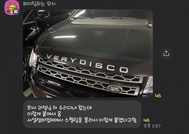 그런데 수리 후 되돌아온 차량이 DISCOVERY가 아니라, VERYDISCO라는 철자로 바뀌어 있었다는 것이다. 심지어 VERYDISCO는 철자의 수평도 맞지 않고 들쑥날쑥하게 붙어있었다. "사설 정비업체에서 스펠링을 몰라서 이렇게 붙였다고 한다"라는 것이 글쓴이의 추정이다.