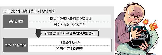 연내 기준금리 인상이 2차례 예고돼 올해 말로 가면 7%대를 넘어설 것으로 보인다. 이렇게 되면 시중은행 기준으로 13년 만에 대출 금리가 7%대를 넘게 된다. 이에 따라 다중 채무자와 '영끌' '빚투'에 나선 대출자들의 고통은 커질 전망이다.