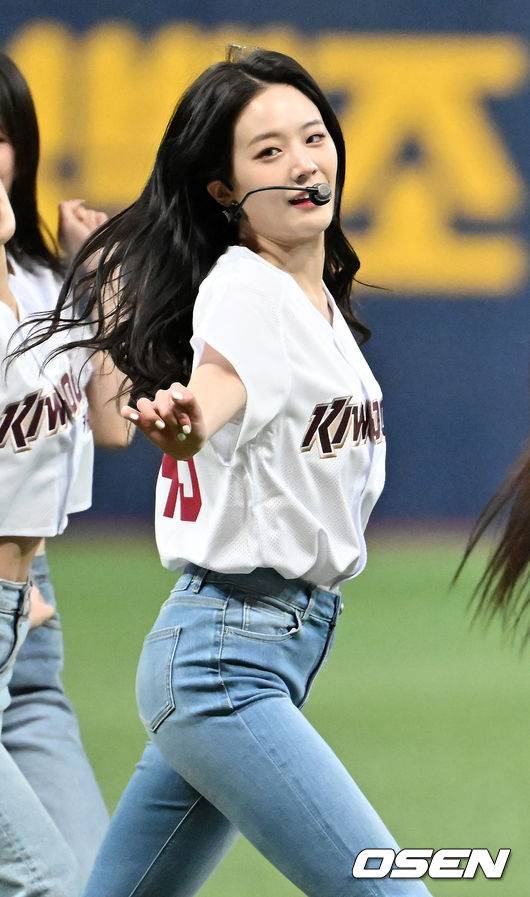경기 전 걸그룹 프로미스나인(fromis_9) 장규리가 멤버들과 함께 그라운드 공연을 하고 있다. 2022.04.06 /rumi@osen.co.kr