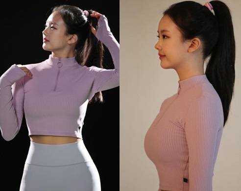 연보라색 크롭티에 딱붙는 레깅스로 시선을 강탈하는 동시에 잘록한 허리라인으로 주목 받았습니다.
