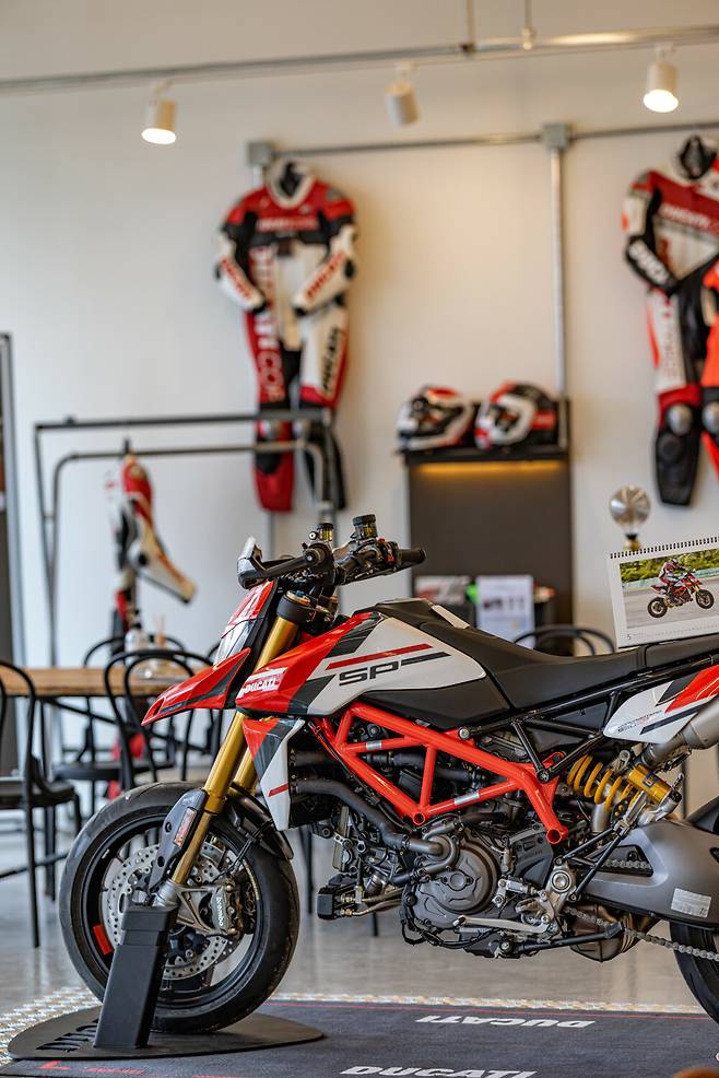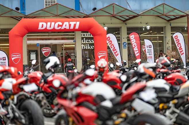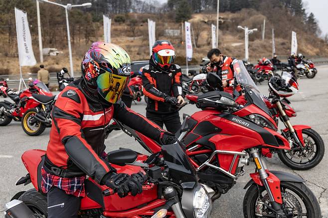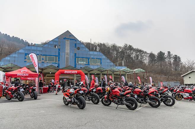 타이어는 어느 정도 열이 올라오니 스포츠 타이어 본연의 성능을 제대로 내준다. 그래도 방심은 금물이다. 아직 노면에는 염화칼슘의 잔재가 남아 언제든 바이크를 날려버릴 준비를 하고 있다. 이런 날 일수록 더 조심해야 한다. 아르떼 파인은 양평의 6번국도변 용머리 휴게소 자리에 들어선 까페다. 그러니까 아마도 거의 모든 두카티 라이더들이 같은 목적지로 달릴 것이다. 그런데 목적지까지 가는 동안 두카티는 두 팀 정도만 마주쳤다. 오후에 예정된 비 소식 때문에 참가자가 별로 없나? 의아한 마음에 목적지에 들어섰는데 깜작 놀랐다. 이제 행사가 시작 30분 지났는데 주차장이 이미 빨간 바이크로 가득 찼다. 다들 일찍 출발했구나.